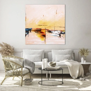 Obraz na szkle „Wieczór w przystani” to nastrojowa kompozycja malarska, przedstawiająca zacumowane łodzie w ciepłym świetle zachodu słońca. Tło w odcieniach różu, pomarańczu i żółci kontrastuje z nasyconymi barwami łodzi, tworząc dynamiczną, a jednocześnie wyciszającą impresję nad wodą.