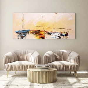 - Obraz przedstawia kolorowe łodzie zacumowane w przystani o zachodzie słońca, namalowane w stylu impresyjnym. Ciepła, malarska kompozycja idealna do wnętrz marynistycznych i nowoczesnych.