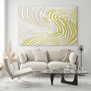 - Abstrakcyjny obraz z dynamicznymi, falistymi liniami w beżowych i limonkowych tonach na białym tle. Harmonijna i estetyczna forma idealna do jasnych, nowoczesnych wnętrz w stylu minimalistycznym.