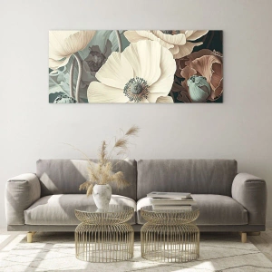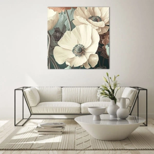 Obraz wyróżnia się niezwykłą lekkością i miękkością barw. Harmonijna kompozycja kwiatów została zaprojektowana tak, by wprowadzać poczucie łagodności i ukojenia. Tło w ciemnym, szmaragdowym tonie podkreśla kontrastowo jasne kwiaty, eksponując ich subtelne piękno i naturalny wdzięk.