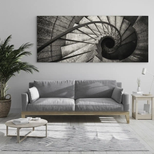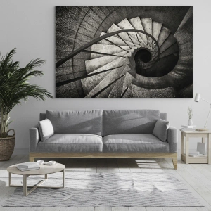 Obraz na szkle - Czarno-białe spiralne schody z perspektywy lotu ptaka - 100x70cm - Schodami w górę, schodami w dół - Nowoczesna dekoracja ścienna do salonu, kuchni i sypialni ARTTOR