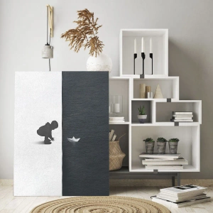 Obraz na szkle - Postać dziecka z papierową łódką na tle kontrastowych połówek - 70x100cm - Wielka wyprawa - Nowoczesna dekoracja ścienna do salonu i sypialni ARTTOR