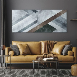 Obraz "Wyszukana elegancja geometrii" to harmonijna gra linii, kształtów i kolorów utrzymanych w chłodnej, stonowanej palecie barw. Kompozycję tworzą przecięcia i układy prostokątów, przecinających się pod różnymi kątami, co buduje wrażenie głębi i uporządkowanej przestrzeni. Dominujące odcienie szarości i ciemnej zieleni nadają dziełu wyważonego, eleganckiego charakteru.