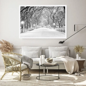 Plakat - Zimowa alejka z drzewami pokrytymi śniegiem w monochromatycznym ujęciu - 100x70cm - Cztery pory roku – zima - Nowoczesna dekoracja ścienna do salonu i sypialni ARTTOR