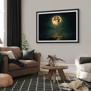 Plakat w czarnej ramie - Człowiek z Księżycem na tle gwieździstego nieba - 70x50cm - Jeden taki, co ukradł Księżyc - Nowoczesna dekoracja ścienna do salonu i sypialni ARTTOR