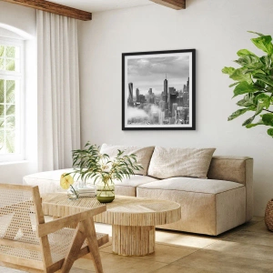 Plakat w czarnej ramie - Czarno-biały widok na panoramę miasta z wieżowcami w chmurach - 50x70cm - Pejzaż amerykański - Nowoczesna dekoracja ścienna do salonu i sypialni ARTTOR