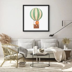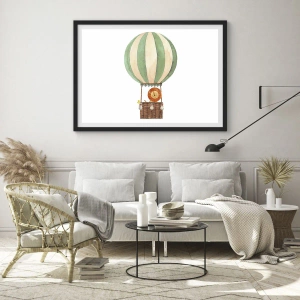 Plakat w czarnej ramie - Balon z uśmiechniętym lwem w koszu w pastelowych barwach - 70x50cm - Podróże Leona - Nowoczesna dekoracja ścienna do salonu i sypialni ARTTOR