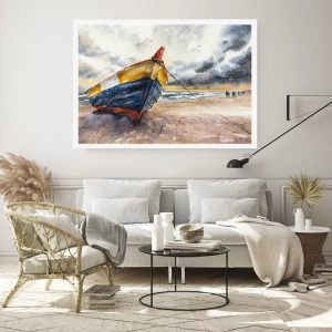 Plakat - Akwarelowa łódź na plaży o zachodzie słońca - 50x70cm - Odpoczynek na brzegu - Nowoczesna dekoracja ścienna do salonu, kuchni i sypialni ARTTOR