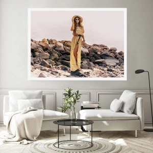 Plakat - Kobieta w stylu boho na tle kamienistej plaży - 100x70cm - Magia kamieni - Nowoczesna dekoracja ścienna do salonu i sypialni ARTTOR