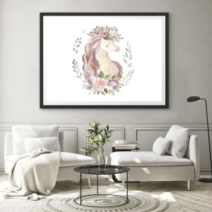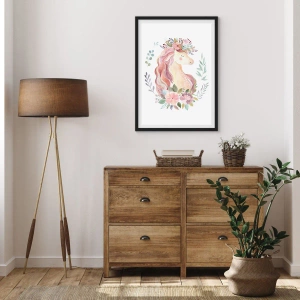Plakat w czarnej ramie - Jednorożec w pastelowych kolorach otoczony kwiatami - 70x50cm - Zaproszenie do świata baśni - Nowoczesna dekoracja ścienna do salonu i sypialni ARTTOR