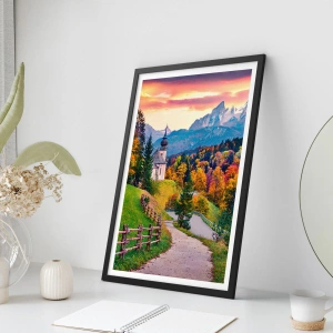 Plakat w czarnej ramie - Górska kaplica wśród jesiennych drzew o zachodzie słońca - 50x70cm - Pejzaż jak malowanie - Nowoczesna dekoracja ścienna do salonu i sypialni ARTTOR