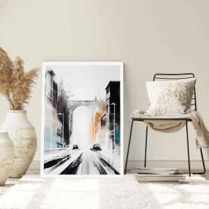 Plakat - Abstrakcyjna panorama miasta z łukowym mostem - 100x70cm - Studium miasta: architektura i ruch - Nowoczesna dekoracja ścienna do salonu i sypialni ARTTOR