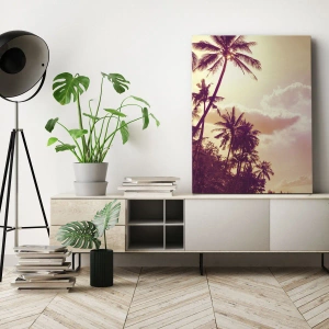 • Artystyczny obraz przedstawiający tropikalne palmy oświetlone zachodzącym słońcem, z różowo-pomarańczowym niebem w tle. Idealna dekoracja wprowadzająca ciepły klimat lata do wnętrz o dowolnym stylu.