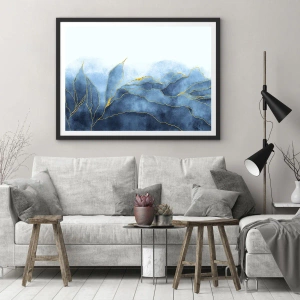 Plakat w czarnej ramie - Abstrakcyjne fale w odcieniach niebieskiego ze złotymi akcentami - 70x50cm - Błękit w złocie - Nowoczesna dekoracja ścienna do salonu i sypialni ARTTOR