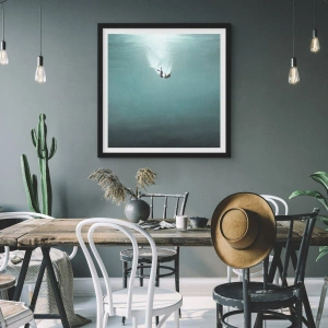 Tonięcie w wodzie w tym artystycznym ujęciu nabiera metaforycznego znaczenia – może symbolizować zarówno poddanie się chwili, jak i poszukiwanie głębszego sensu. Delikatna gra światła i cienia podkreśla wrażenie przestrzeni i bezkresu. Obraz ten doskonale wpisuje się w nowoczesne wnętrza, dodając im niezwykłej, niemal filmowej atmosfery.