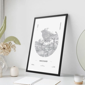 Plakat w czarnej ramie - Minimalistyczna mapa Vancouver w czarno-białej tonacji - 50x70cm - Anatomia Vancouver - Nowoczesna dekoracja ścienna do salonu i sypialni ARTTOR