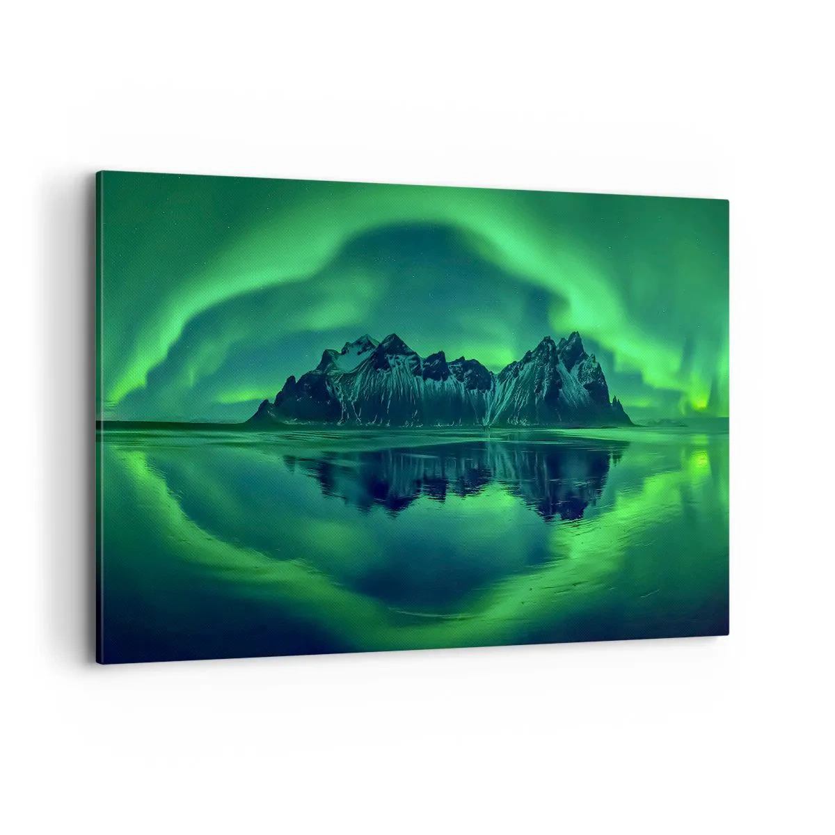 Obraz na płótnie - Góry otoczone zorzami polarnymi odbijającymi się w wodzie - 100x70cm - W ramionach zorzy - Nowoczesna dekoracja ścienna do salonu, kuchni i sypialni ARTTOR