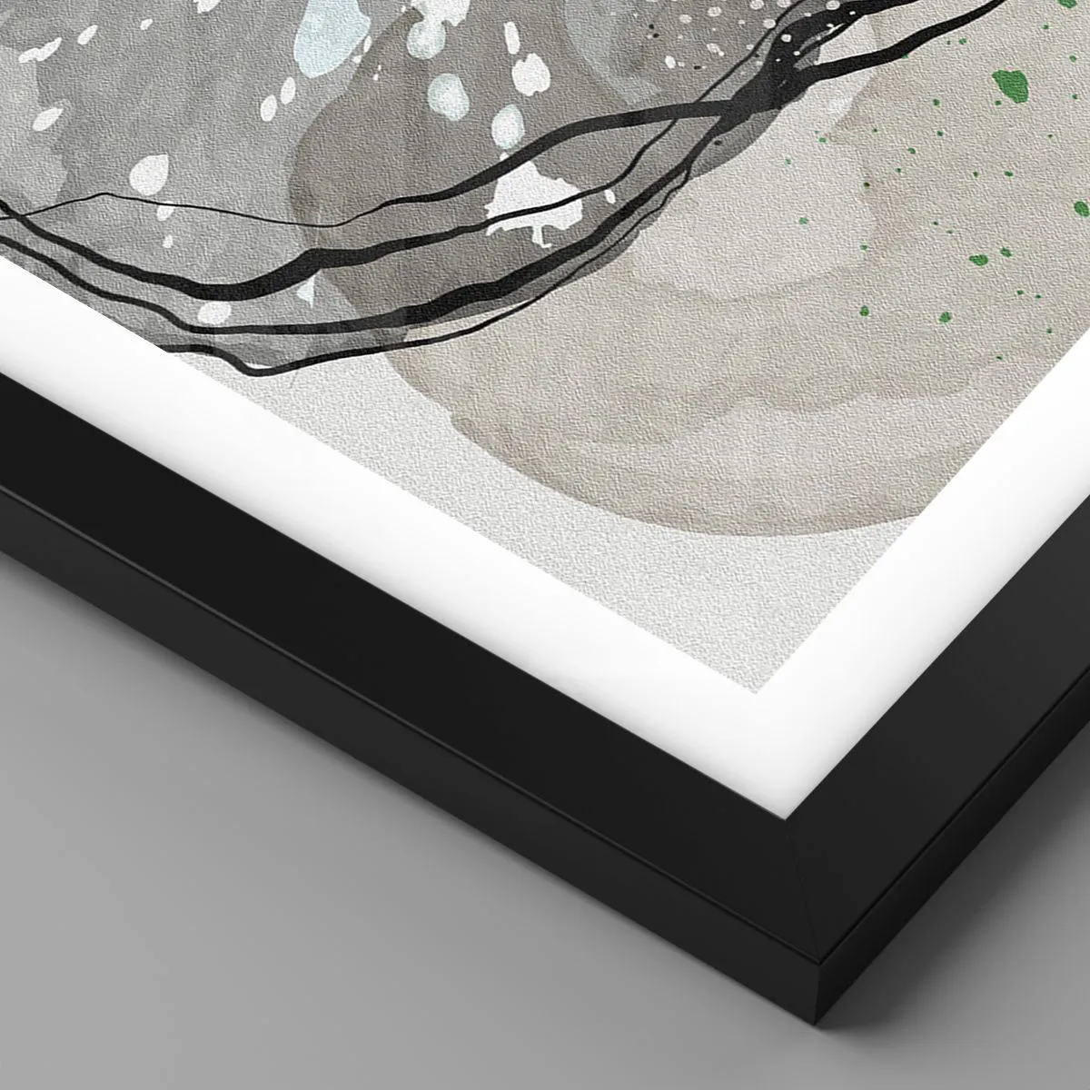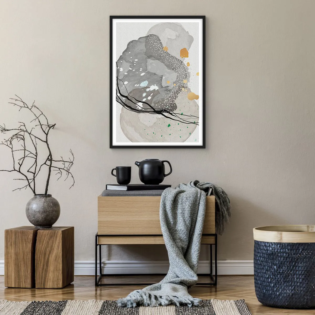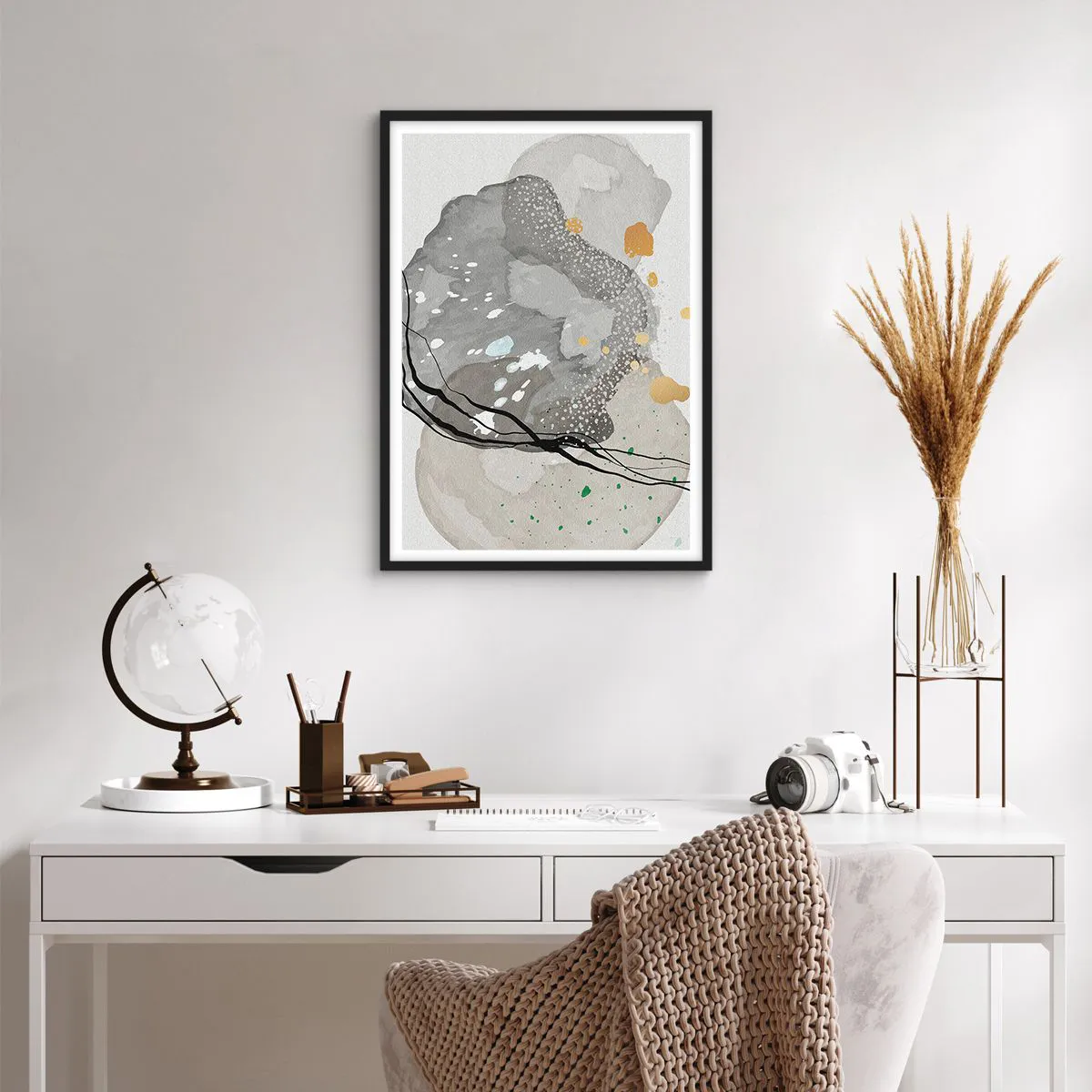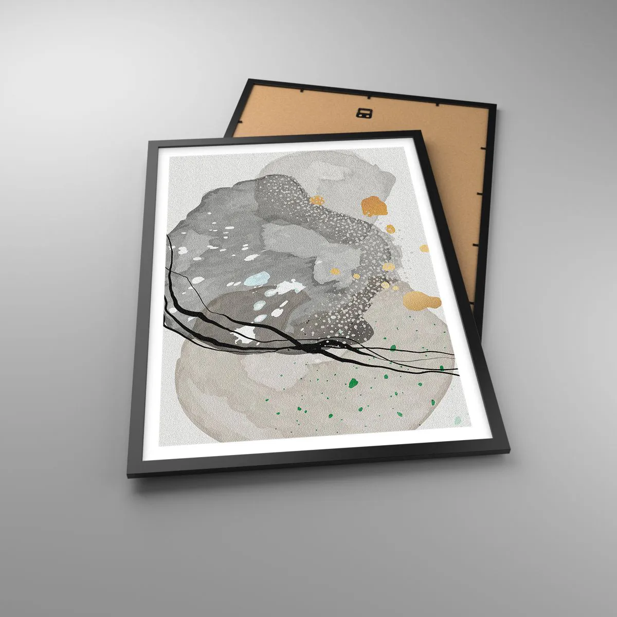Abstrakcyjna forma inspirowana naturalnymi kształtami nawiązuje do kamieni, minerałów czy organicznych struktur. Dzięki subtelnej palecie kolorystycznej oraz kontrastującym liniom, plakat wprowadza do wnętrza atmosferę równowagi i wyrafinowania. Połączenie neutralnych odcieni z delikatnymi detalami sprawia, że dzieło nabiera trójwymiarowego efektu.