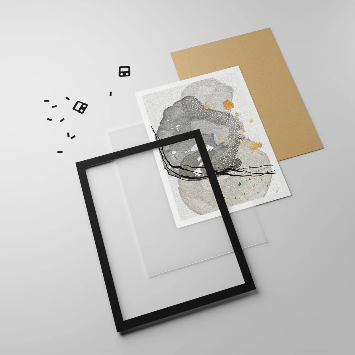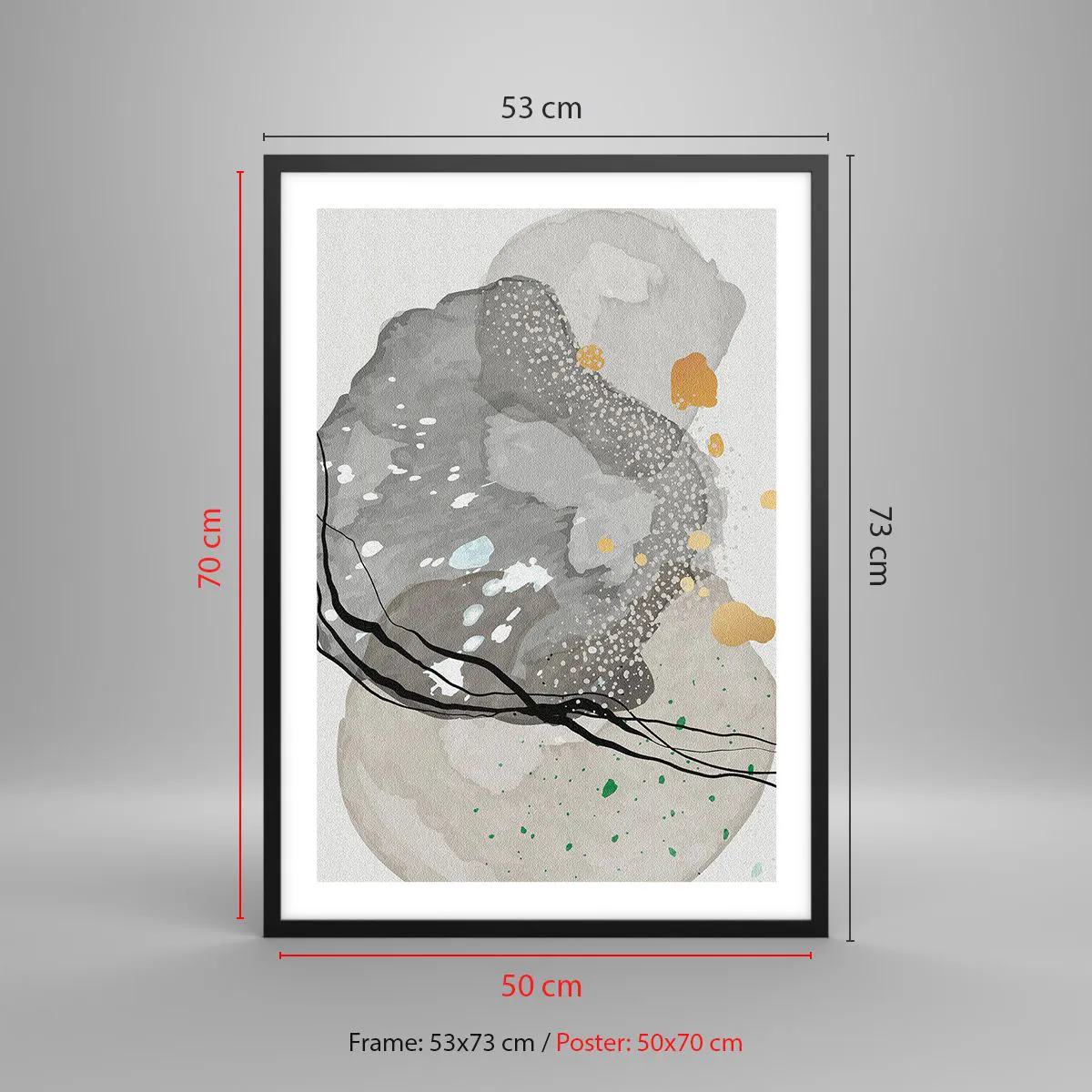 Plakat w czarnej ramie - Kompozycja organicznych kształtów w szarościach i złocie - 50x70cm - Kompozycja organiczna - Nowoczesna dekoracja ścienna do salonu i sypialni ARTTOR