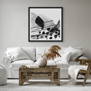 - Nowoczesny plakat przedstawiający abstrakcyjną kompozycję w czerni i bieli, z dynamicznymi liniami i geometrycznymi elementami. Doskonała dekoracja dla miłośników sztuki współczesnej.