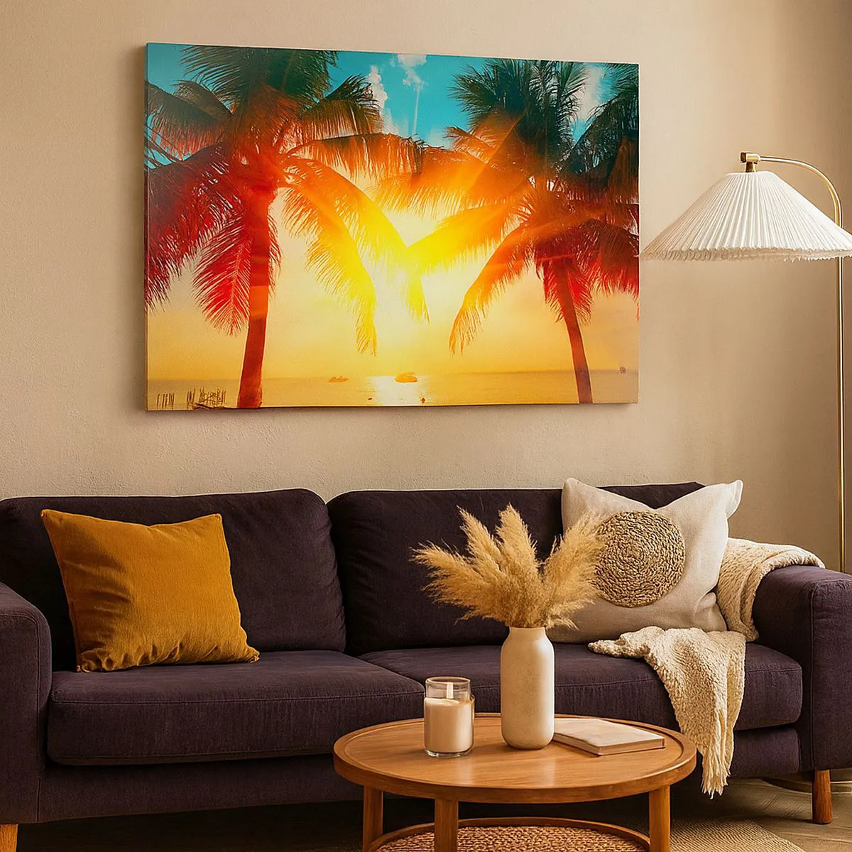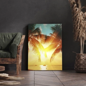 Obraz na płótnie - Palmy oświetlone ciepłym światłem zachodzącego słońca - 120x80cm - Egzotyczna para - Nowoczesna dekoracja ścienna do salonu, kuchni i sypialni ARTTOR