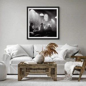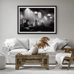 Plakat w czarnej ramie - Czarno-biała scena jazzowego klubu nocnego - 100x70cm - W jazzowym klimacie - Nowoczesna dekoracja ścienna do salonu i sypialni ARTTOR