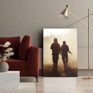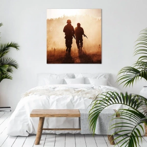 - Obraz na płótnie przedstawiający żołnierzy maszerujących w porannej mgle na tle natury. Idealna dekoracja wprowadzająca atmosferę spokoju i determinacji do wnętrza.