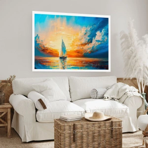 Plakat - Żaglówka na tle zachodzącego słońca i barwnych chmur - 100x70cm - Żegluga w złocie - Nowoczesna dekoracja ścienna do salonu i sypialni ARTTOR
