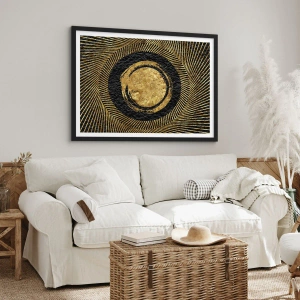 Plakat w czarnej ramie - Geometryczna kompozycja w czerni i złocie z promieniami - 70x50cm - Kompozycja glamour - Nowoczesna dekoracja ścienna do salonu i sypialni ARTTOR