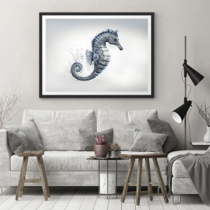 Plakat "Subtelny żart natury" to subtelna i detaliczna ilustracja konika morskiego, który został przedstawiony z niezwykłą precyzją i dbałością o szczegóły. Zastosowane odcienie błękitu i szarości nadają mu elegancki i harmonijny wygląd, doskonale komponując się z jasnym, neutralnym tłem.