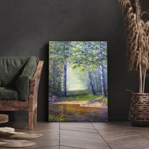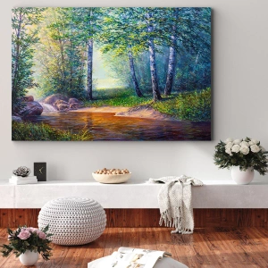 - Obraz przedstawia spokojny leśny pejzaż z brzozami i strumykiem, otulony promieniami słońca. Idealna dekoracja, która wprowadza harmonię do wnętrz salonu czy sypialni.