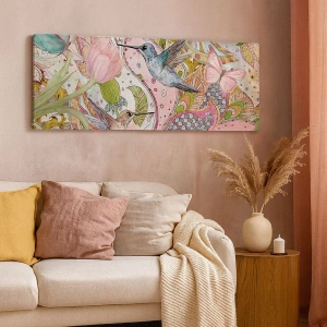 - Obraz przedstawia kolorowe kolibry i motyle wśród roślin, tworząc harmonijną i delikatną kompozycję. Idealny dodatek do wnętrz o romantycznym i naturalnym charakterze.