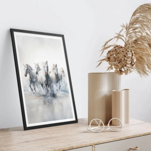 Plakat w czarnej ramie - Białe konie galopujące przez wodę - 70x50cm - Biała magia - Nowoczesna dekoracja ścienna do salonu i sypialni ARTTOR