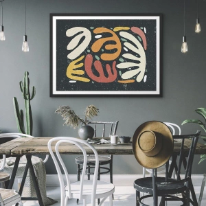 Plakat w czarnej ramie - Abstrakcyjne kształty w ciepłych kolorach na ciemnym tle - 70x50cm - Kompozycja – zaraz cię schwytam - Nowoczesna dekoracja ścienna do salonu i sypialni ARTTOR