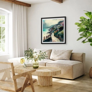 Plakat w czarnej ramie - Malownicza nadmorska ścieżka w akwarelowym stylu - 50x70cm - Śródziemnomorskie miasteczko - Nowoczesna dekoracja ścienna do salonu i sypialni ARTTOR