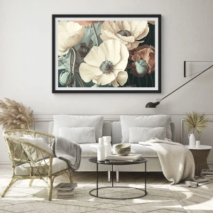Plakat w czarnej ramie - Delikatne kwiaty w pastelowych odcieniach na ciemnym tle - 50x70cm - Szept maków - Nowoczesna dekoracja ścienna do salonu i sypialni ARTTOR