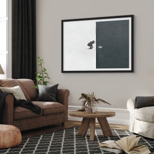 Plakat w czarnej ramie - Postać dziecka z papierową łódką na tle kontrastowych połówek - 70x50cm - Wielka wyprawa - Nowoczesna dekoracja ścienna do salonu i sypialni ARTTOR