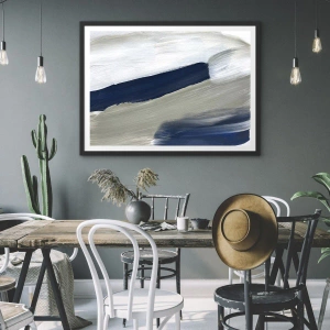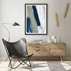 Plakat w czarnej ramie - Abstrakcyjne pociągnięcia pędzla w odcieniach granatu - 50x70cm - Spotkanie z bielą - Nowoczesna dekoracja ścienna do salonu i sypialni ARTTOR