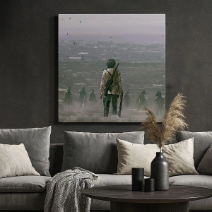 - Tajemniczy obraz przedstawiający postać z bronią naprzeciw grupy ludzi w dystopijnym krajobrazie, doskonały do wnętrz o nowoczesnym stylu.