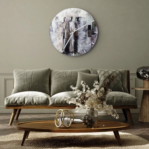 Zegar ścienny „Tajemnicza trójka” to przykład artystycznej interpretacji ludzkiej obecności i emocji. Na jego tarczy widoczne są trzy postacie, ukazane w stylu abstrakcyjnym – rozmyte, geometryczne i ekspresyjne. Kolorystyka utrzymana jest w stonowanych odcieniach brązu, szarości i bieli z domieszką fioletów, co nadaje obrazowi głębi oraz nastrojowego charakteru.