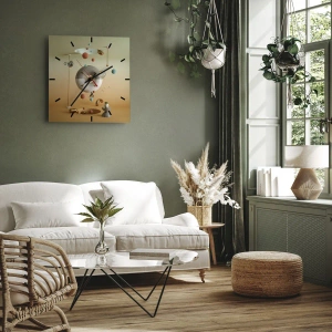 - Zegar z abstrakcyjnym motywem przestrzennych kul i geometrycznych kształtów na tle w odcieniach beżu. Nowoczesna forma kompozycji wprowadza do wnętrza harmonię, dynamikę i kreatywną energię.