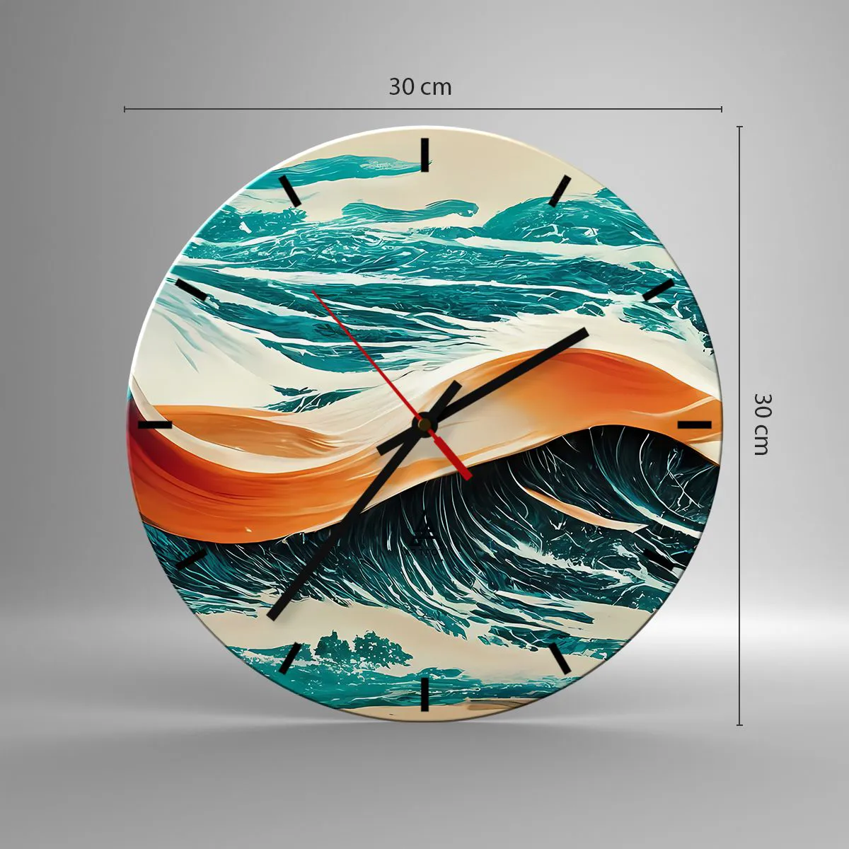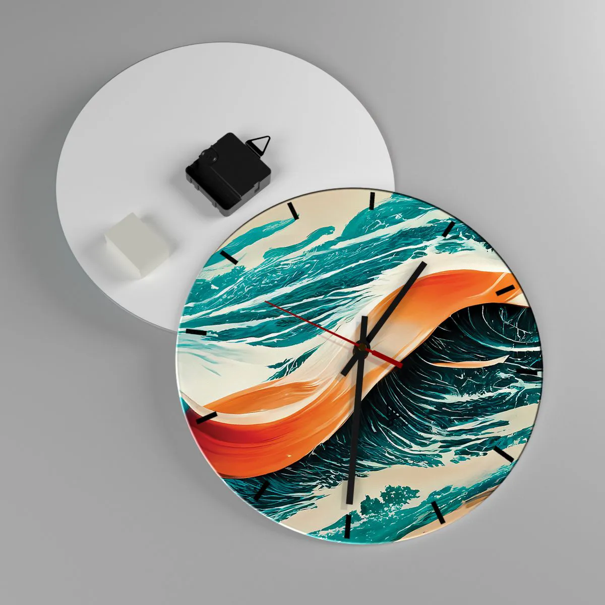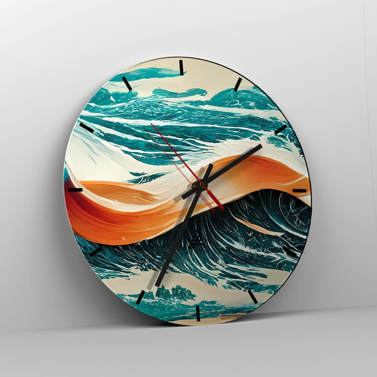 - Zegar przedstawia abstrakcyjną, dynamiczną scenę morskich fal uzupełnioną o kontrastującą pomarańczową wstęgę. Intensywne kolory i płynne linie tworzą efekt ruchu i energii, inspirowany żywiołem oceanu.