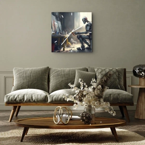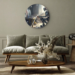 Cała scena, nadrukowana na okrągłym zegarze o wymiarze 30x30 cm, wykonanym na szkle, przyciąga wzrok i inspiruje. Dla wielu będzie to nie tylko urządzenie do odmierzania czasu, ale również wyjątkowa dekoracja ścienna – osobista galeria sztuki współczesnej. Obraz przedstawia moment skupienia, kiedy technologia staje się twórcą, co prowokuje do refleksji nad przyszłością sztuki i rolą maszyn.