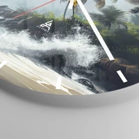 - Zegar ścienny 30x30 cm na szkle z widokiem tropikalnej plaży, palm i rozbijających się fal oceanu. Egzotyczna dekoracja o letnim i relaksującym charakterze.