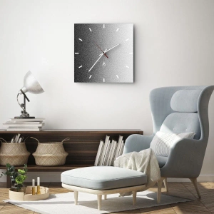 Zegar wykonany jest z bezpiecznego szkła o grubości 4mm. Technologia wykonania zegara jest zgodna z klasą bezpieczeństwa 2B2 według normy PN-EN 12600:2004, która gwarantuje wytrzymałość na uderzenia. Zegar na szkle jest gotowy do powieszenia – posiada metalową zawieszkę zamocowaną z tyłu zegara oraz piankowy dystans regulujący równomierny odstęp zegara od ściany. Zegar posiada cichy mechanizm płynący zasilany baterią 1,5V - bateria AA (bateria nie jest umieszczana w zestawie).