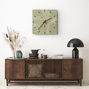- Zegar ścienny z beżowym tłem i subtelnym białym wzorem z linii oraz łuków. Nowoczesna, graficzna kompozycja idealnie pasuje do minimalistycznych wnętrz. Stonowany, elegancki dodatek dekoracyjny.