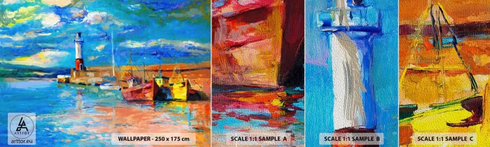 Fototapeta Próbka Premium Sand - Popołudnie w tęczowej zatoce - Port Rybacki, Kuter Rybacki, Latarnia Morska - 100x30 cm