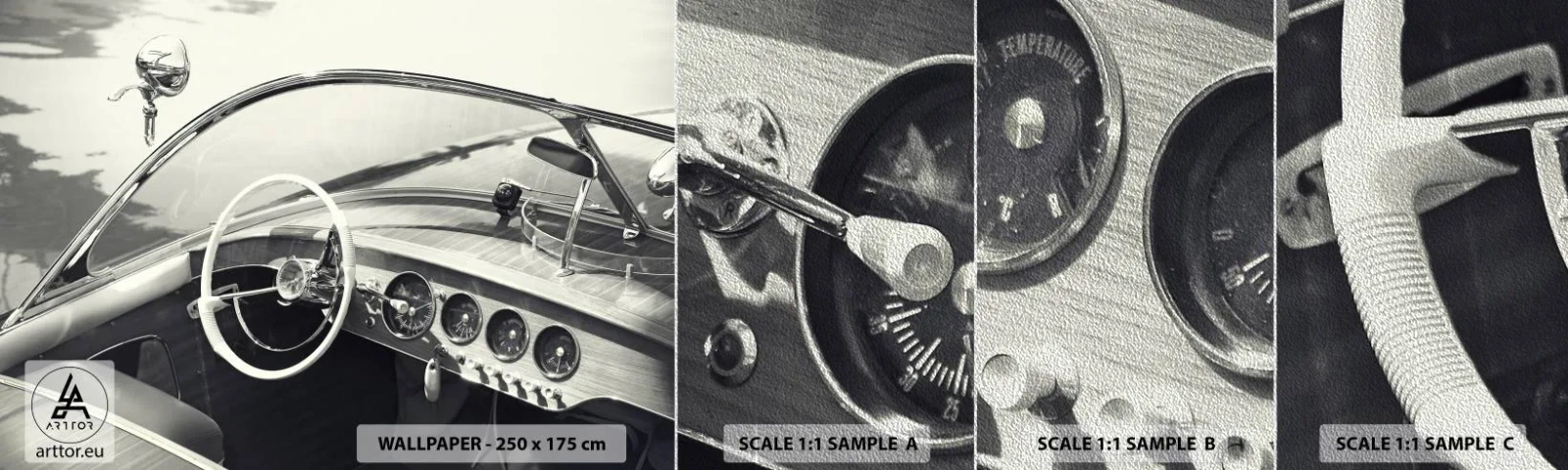 Fototapeta Próbka Premium Sand - Pogoda dla bogaczy - Łódź Vintage, Motorówka, Czarno-Biały - 100x30 cm