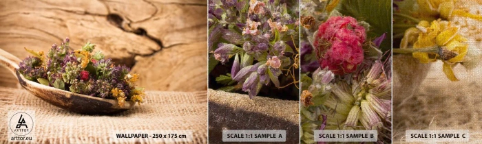 Fototapeta Próbka Premium Canvas - Kwiecie barwiste i zioła pachnące - Natura, Suszone Zioła, Kuchnia - 100x30 cm