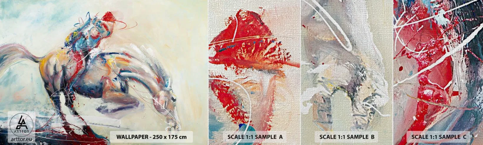 Fototapeta Próbka Premium Canvas - Trzymaj się, lecimy - Zwierzęta, Koń, Jeździec - 100x30 cm